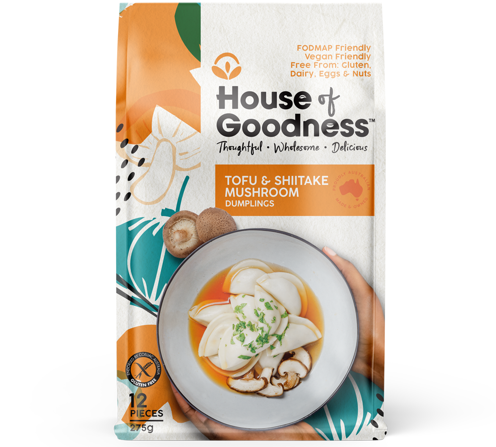 Ingredients (FODMAP Friendly): Filtered Water, Rice Flour, Cabbage, Organic Tofu, Corn, Shiitake Mushroom, Black Fungus, Tapioca Flour, Glutinous Rice Flour, Millet Flour, Sunflower Oil, Gluten-Free Soy Sauce, Xanthan Gum, Potato Starch, Sea Salt, Pepper.