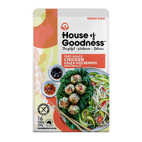 Ingredients: Free-Range Chicken (60%), Filtered Water, Kale (12%), Tapioca Flour, Sunflower Oil, Ginger . Sea Salt, Goji Berries (1%), Fish Sauce (Anchovy, Salt, Sugar), Baking Powder, White Pepper.